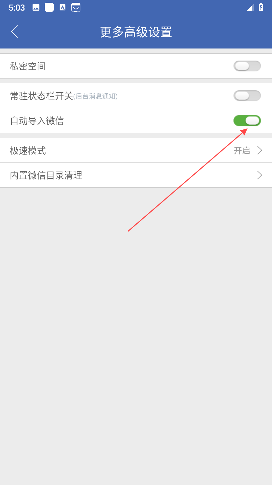 2、進(jìn)入更多高級設(shè)置頁面后,瀏覽設(shè)置列表,找到自動(dòng)導(dǎo)入微信選項(xiàng),此時(shí)可以看到該選項(xiàng)對應(yīng)的開關(guān)按鈕。