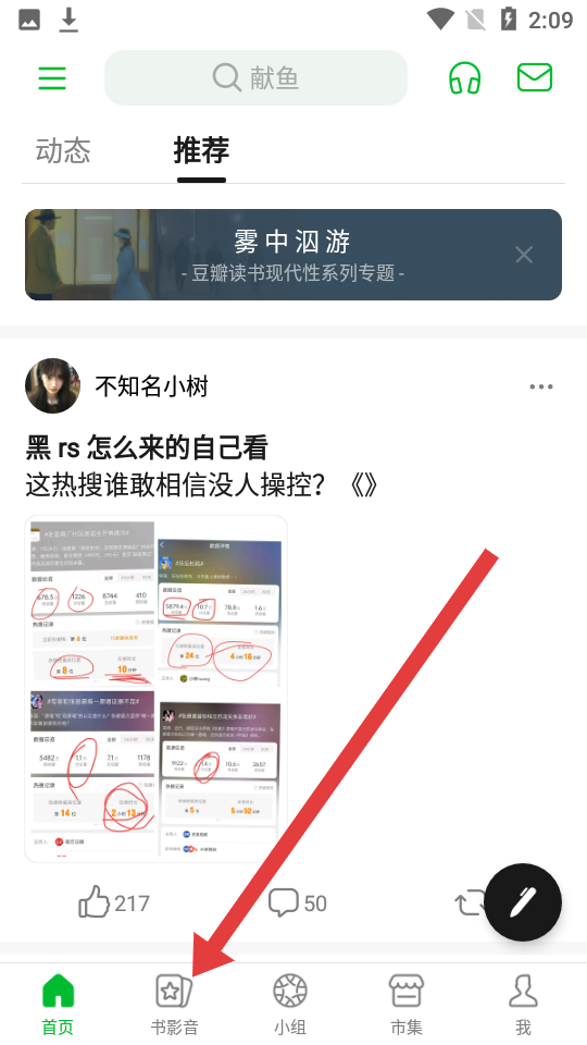 1、打開豆瓣APP之后,點擊底部導航欄中第二個書影音圖標,即可進入書影音界面。