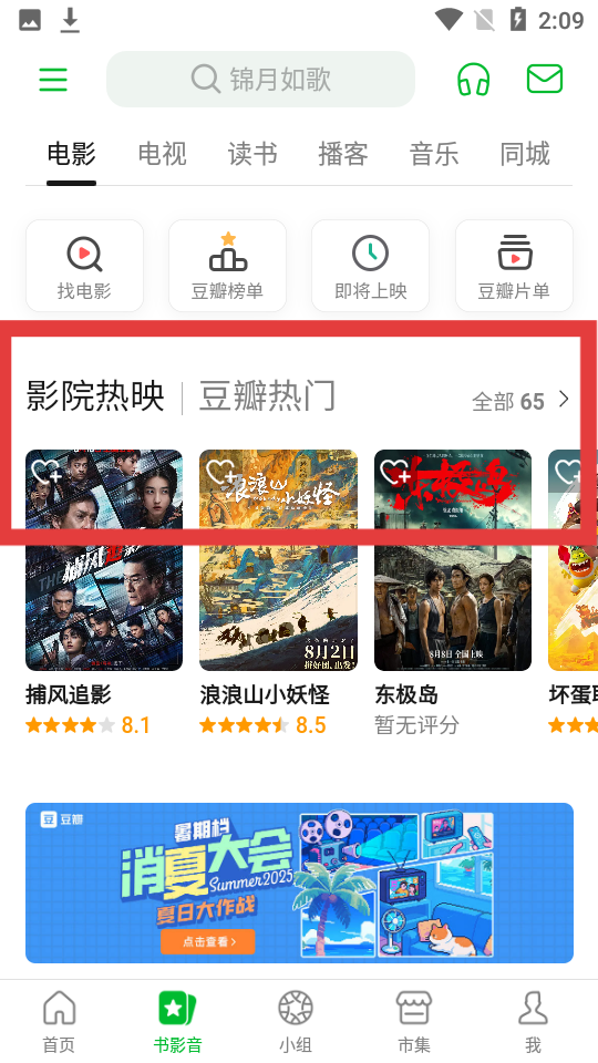 2、在書影音界面中,找到影院熱映或豆瓣熱門區(qū)域,這里展示了當下的熱門電影,點擊全部能查看更多電影。