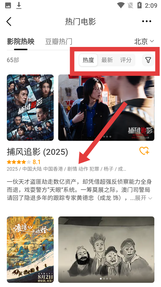 3、進入熱門電影頁面后,可依據(jù)熱度、最新、評分等條件對電影進行排序篩選,點擊感興趣的電影封面或標題,就能查看更多信息。