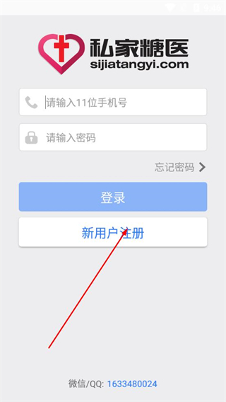 1、在私家糖醫(yī)的登錄頁面,點擊新用戶注冊,進入注冊頁面。