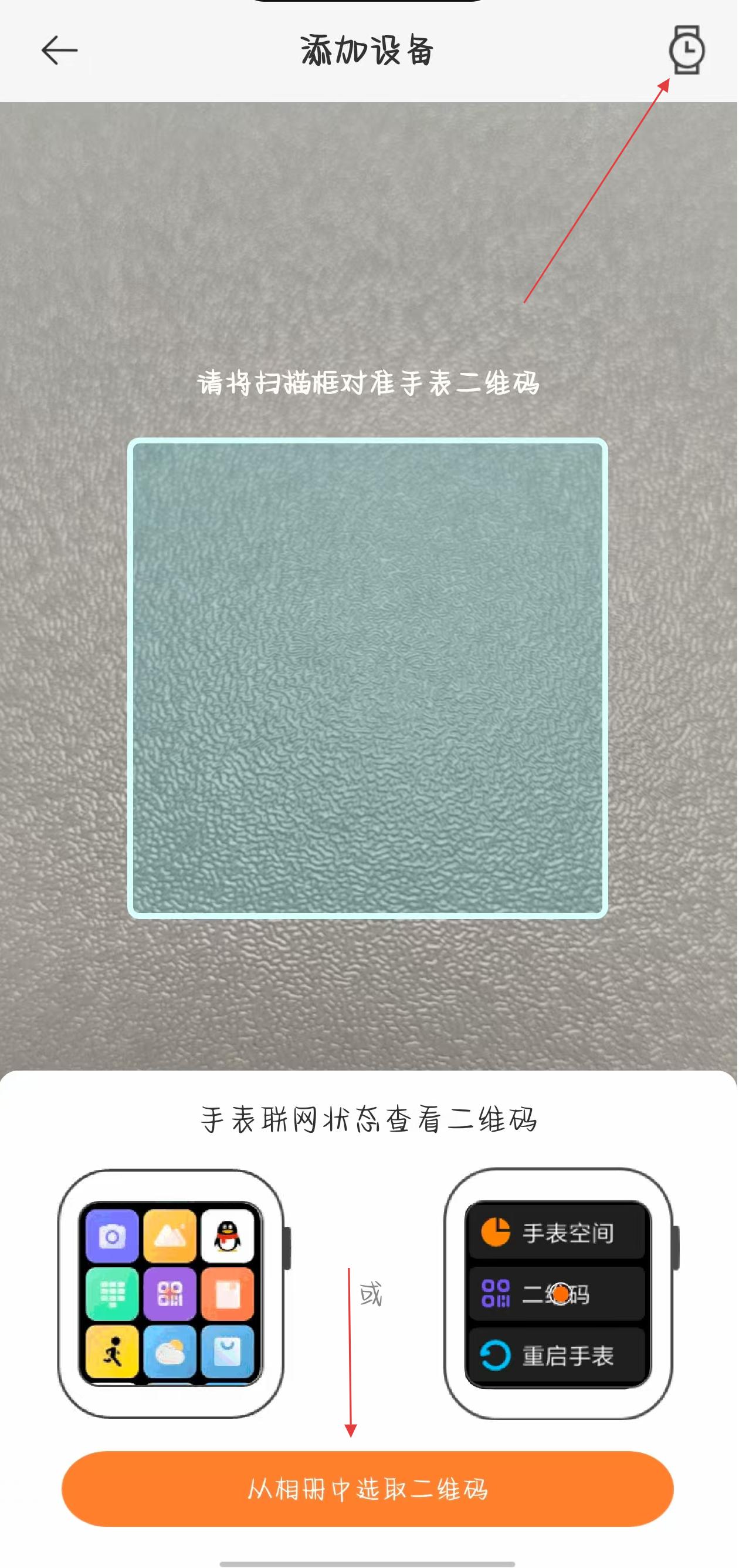 2、進(jìn)入掃碼界面,用手機(jī)攝像頭對(duì)準(zhǔn)手表上的二維碼掃描。