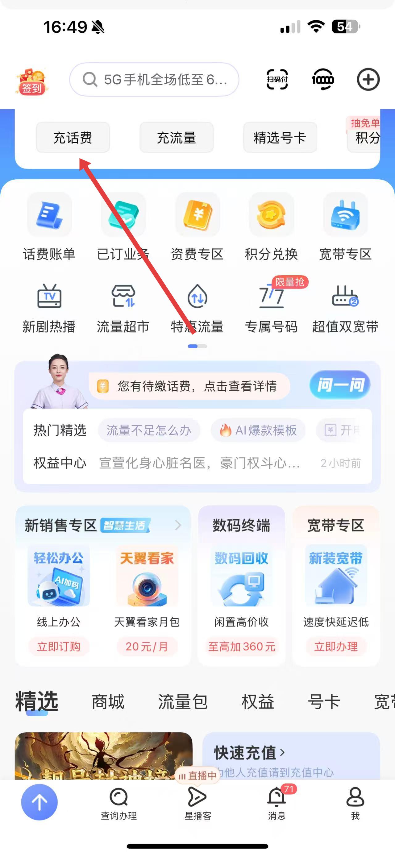 1、打開中國電信對(duì)應(yīng)的手機(jī)營業(yè)廳APP,在首頁找到并點(diǎn)擊充話費(fèi)按鈕。