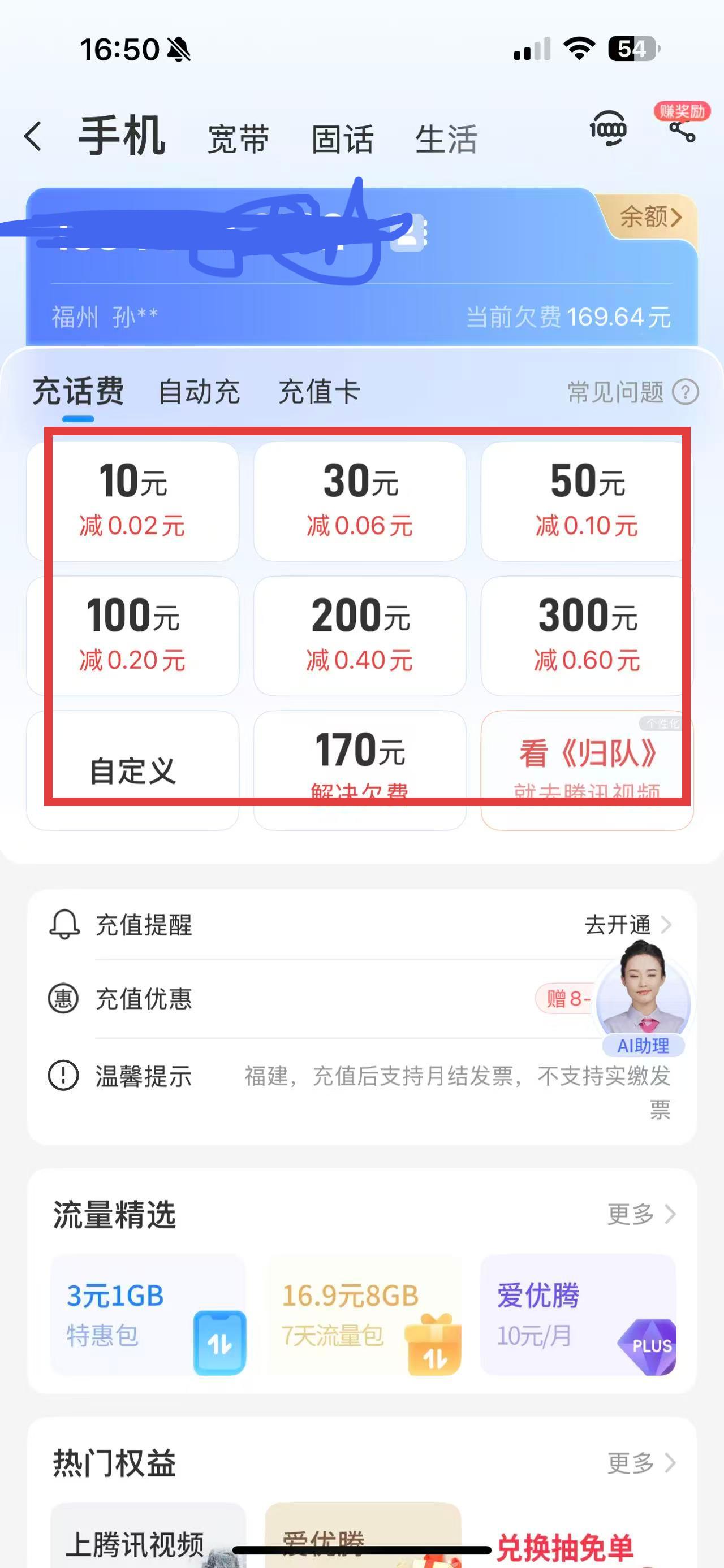 3、根據(jù)自身需求,選擇對(duì)應(yīng)的充值金額選項(xiàng),如10元、30元等,然后按頁面提示完成支付操作,即可完成話費(fèi)充值。