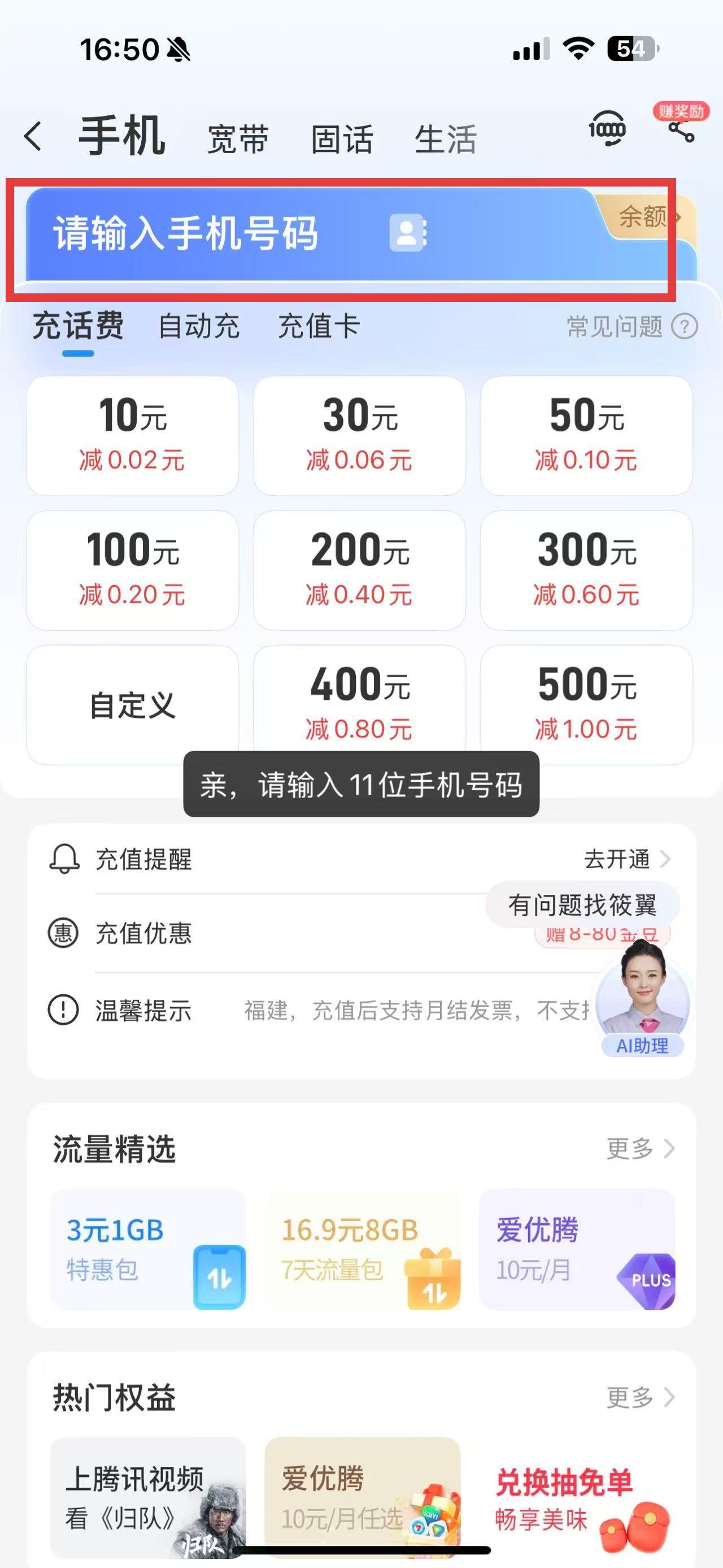 2、進(jìn)入充話費(fèi)界面后,在請(qǐng)輸入手機(jī)號(hào)碼的輸入框內(nèi),準(zhǔn)確填入需要充值的手機(jī)號(hào)碼。