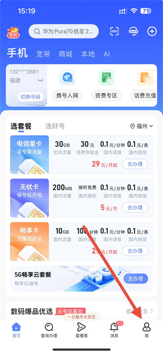 1、在中國電信App界面,點(diǎn)擊右下角我選項(xiàng),進(jìn)入個(gè)人頁面。