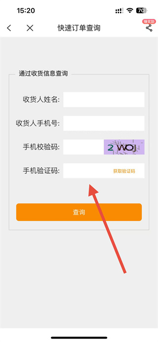4、在快速訂單查詢界面,輸入收貨人姓名、手機(jī)號(hào)、手機(jī)校驗(yàn)碼和驗(yàn)證碼,點(diǎn)擊查詢按鈕,完成其他訂單查詢操作。