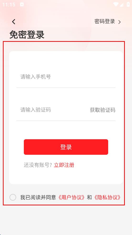 3、在個人頁面,點擊“登錄注冊”區(qū)域,進入登錄界面,可選擇免密登錄等方式,在免密登錄界面,勾選同意協(xié)議。