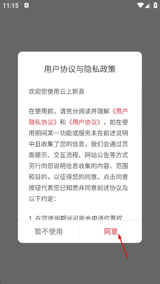 1、打開會彈出“用戶協(xié)議與隱私政策”提示框,仔細閱讀相關內容后,點擊“同意”按鈕。