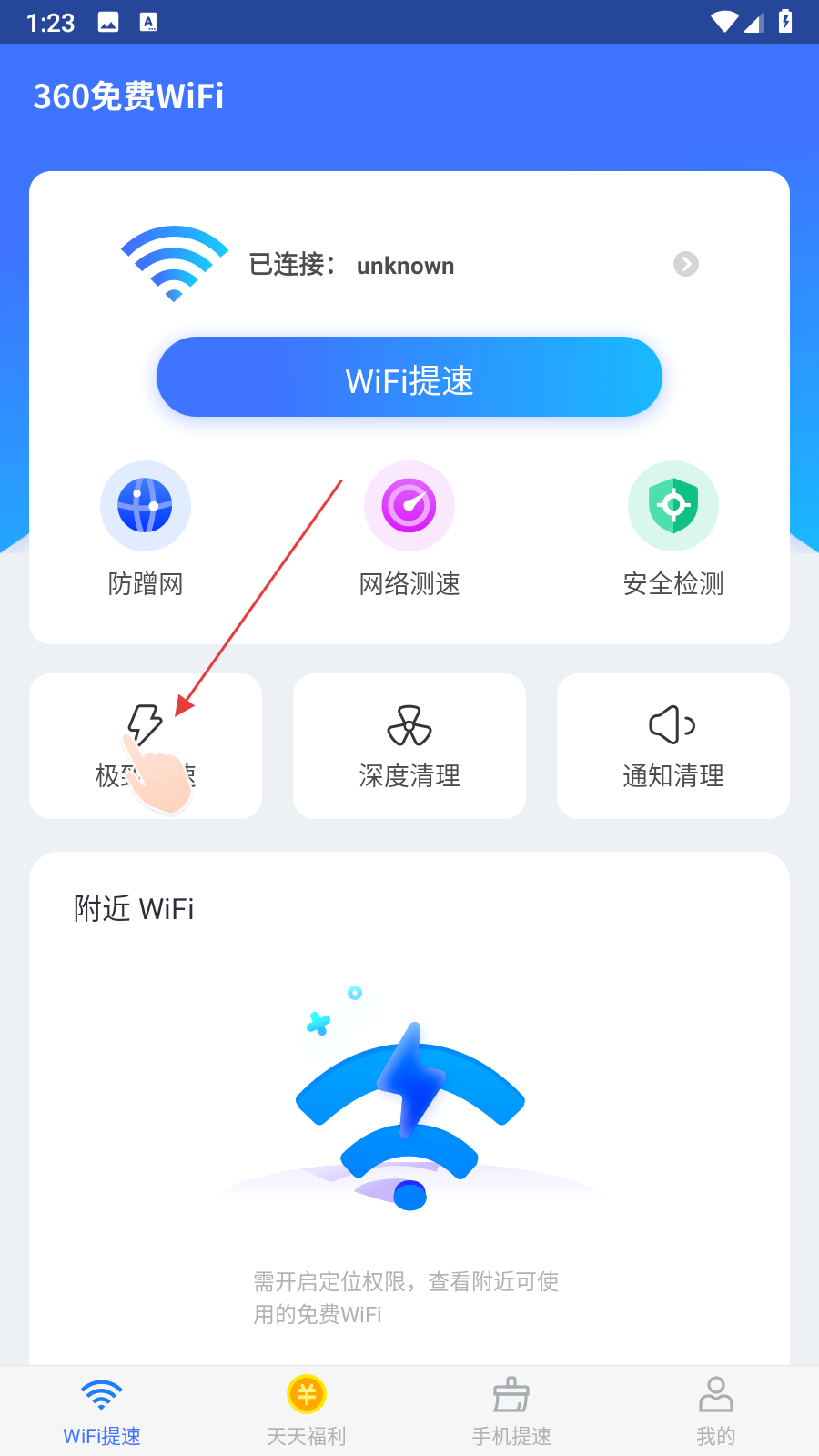 1、打開360免費(fèi)WiFi應(yīng)用,在主界面找到極致加速功能按鈕,點(diǎn)擊該按鈕進(jìn)入極致加速頁面。