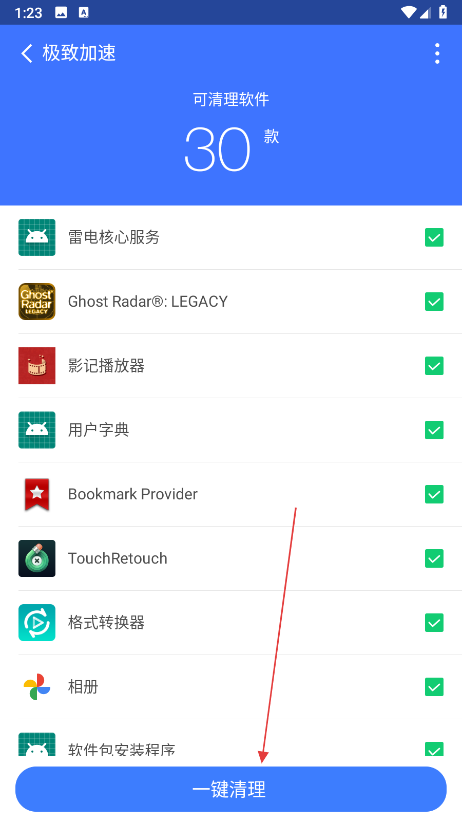 2、進(jìn)入極致加速頁面后,能看到可清理軟件的數(shù)量及具體軟件名稱,確認(rèn)需要清理的軟件后,點(diǎn)擊頁面底部的一鍵清按鈕。