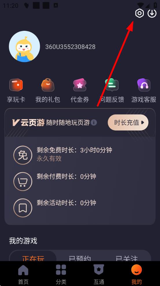 1、打開360游戲大廳APP,點(diǎn)擊底部導(dǎo)航欄中的我的,進(jìn)入個人中心界面,點(diǎn)擊右上角的設(shè)置圖標(biāo)。