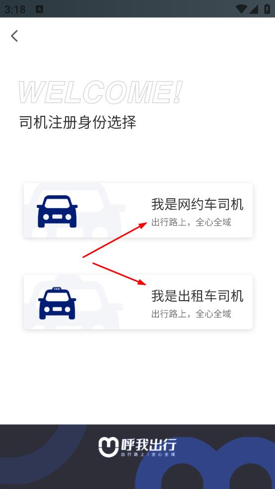 3、在司機(jī)注冊身份選擇頁,依據(jù)自身實(shí)際,選我是網(wǎng)約車司機(jī)或我是出租車司機(jī),開始注冊流程 。