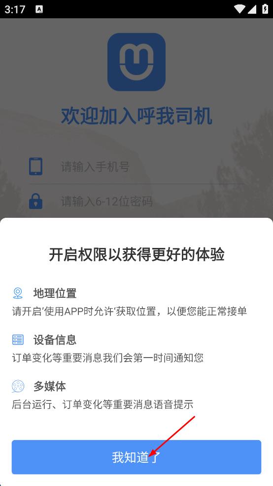 1、打開呼我司機(jī)APP,彈出開啟權(quán)限提示框,點(diǎn)擊我知道了,確認(rèn)知曉地理位置、設(shè)備信息、多媒體等權(quán)限需求。