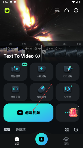 1、打開Filmora,點擊界面中的創(chuàng)建視頻按鈕,進入素材選擇界面。