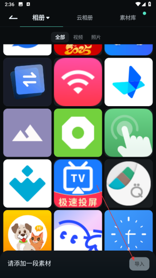 2、在素材選擇界面,從相冊里挑選所需素材,接著點擊導入按鈕,將素材添加到編輯軌道。