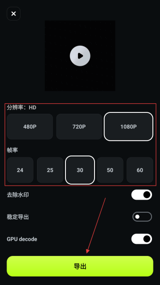 4、在視頻導出設(shè)置界面,選擇合適的分辨率、幀率等參數(shù),最后點擊導出按鈕。