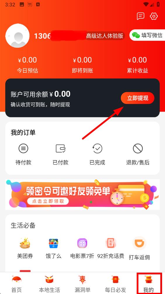 1、打開淘優(yōu)品返利app,點(diǎn)擊底部導(dǎo)航欄我的圖標(biāo)進(jìn)入個(gè)人界面,在賬戶可用余額區(qū)域點(diǎn)擊立即提現(xiàn)按鈕。