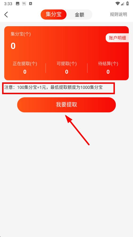 2、進(jìn)入提現(xiàn)界面后查看提取規(guī)則,確認(rèn)可提取集分寶數(shù)量后點(diǎn)擊我要提取。