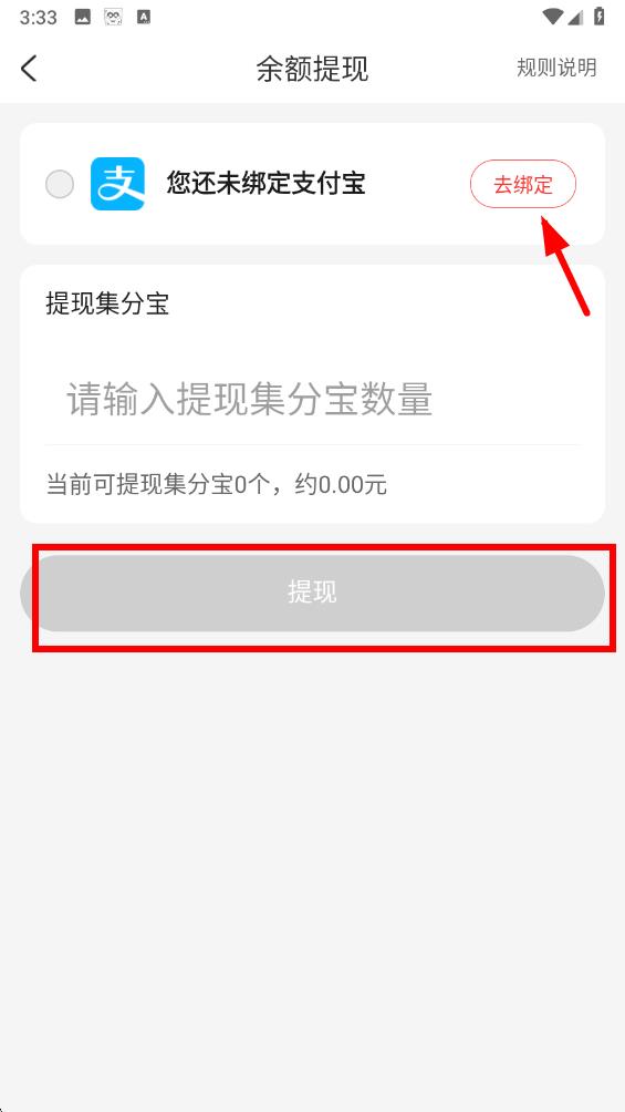 3、在余額提現(xiàn)界面,若未綁定支付寶點(diǎn)擊去綁定完成支付寶賬號(hào)綁定,然后輸入要提現(xiàn)的集分寶數(shù)量點(diǎn)擊提現(xiàn)按鈕完成提現(xiàn)操作。