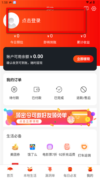 1、在淘優(yōu)品返利app我的頁面,點(diǎn)擊點(diǎn)擊登錄區(qū)域,進(jìn)入登錄界面。