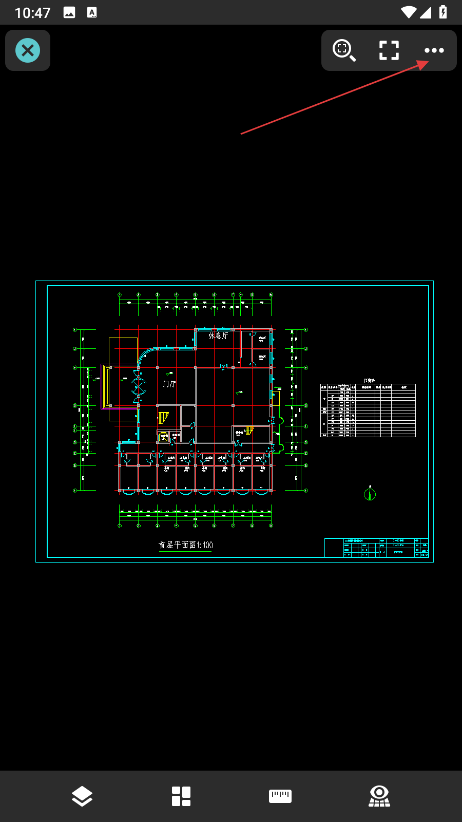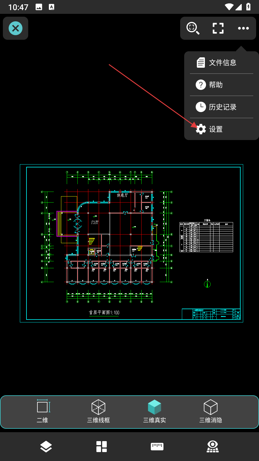 2、在圖紙查看界面,點(diǎn)擊右上角的三點(diǎn)圖標(biāo),彈出包含文件信息,設(shè)置等選項(xiàng)的菜單。