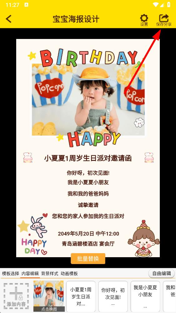 4、定制完成后,點擊右上角保存分享,即可完成寶寶海報制作。