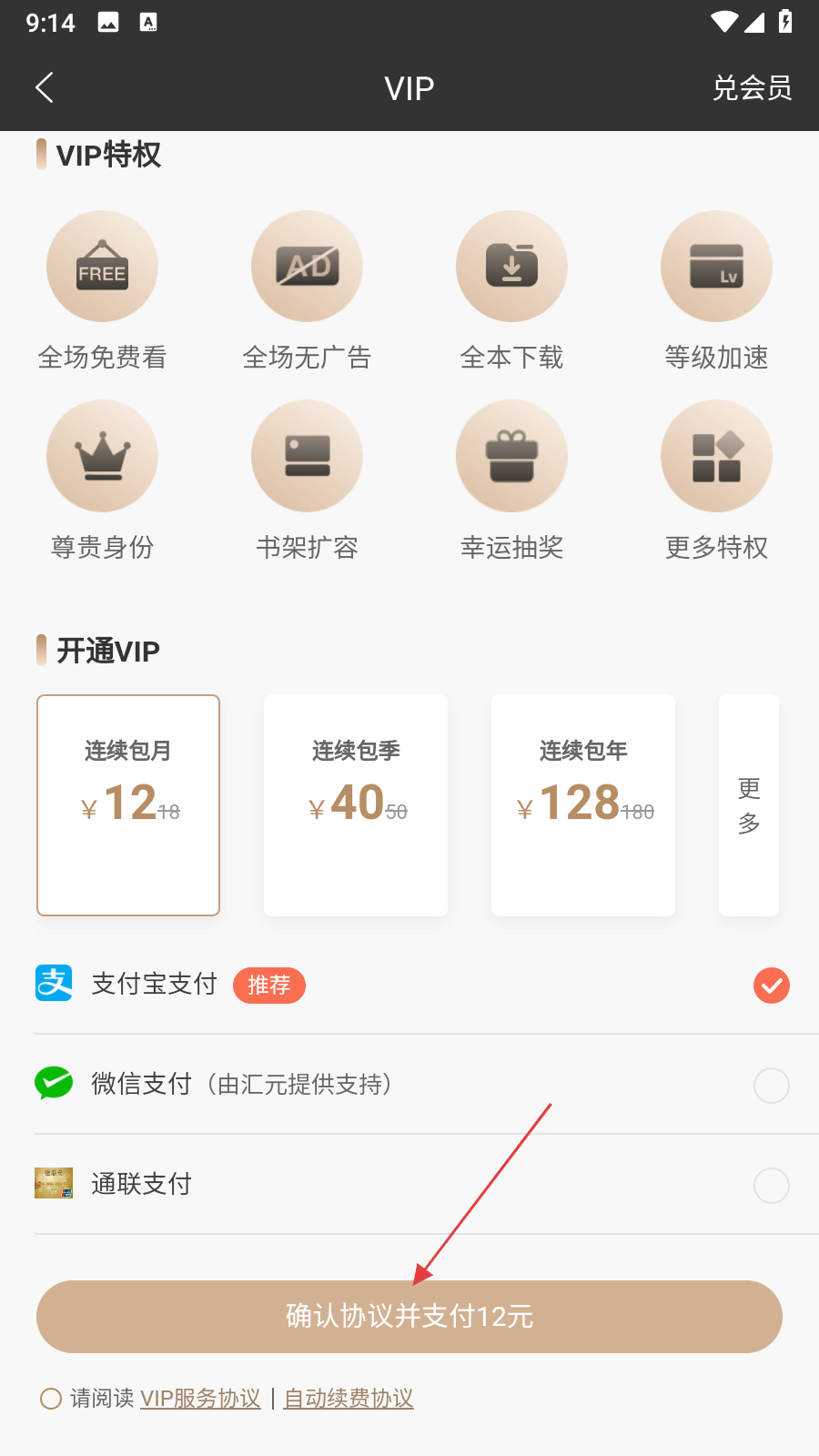 3、在VIP開通頁面,選擇好套餐和支付方式后,點擊確認(rèn)協(xié)議并支付按鈕。