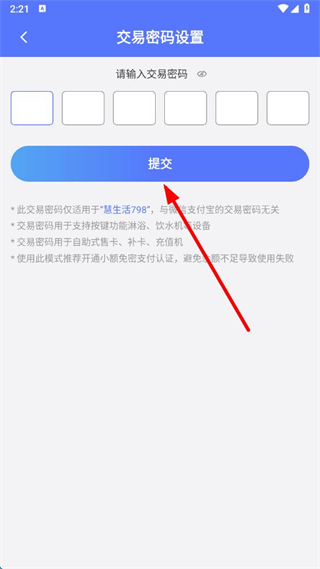 4、在交易密碼設(shè)置頁面輸入交易密碼,點擊提交按鈕,即可完成支付密碼設(shè)置。