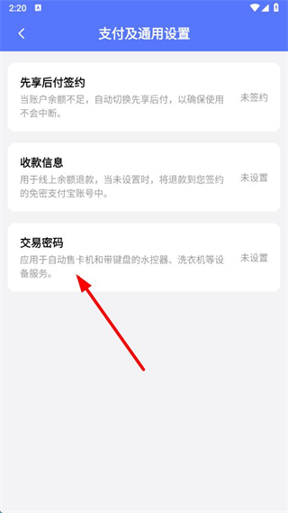 3、在支付及通用設(shè)置頁面點擊交易密碼選項,進(jìn)入交易密碼設(shè)置頁面。