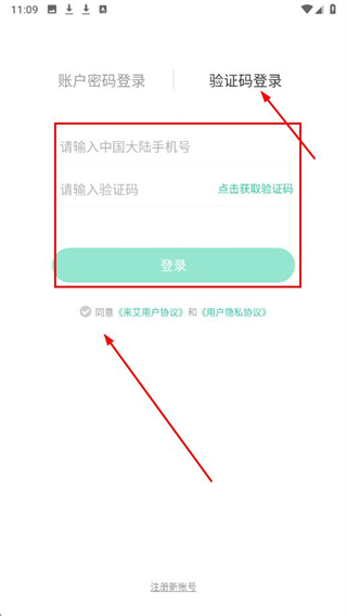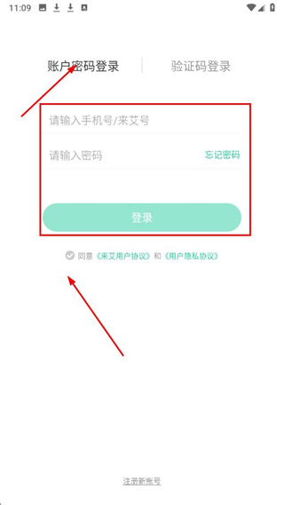 2、可選擇賬戶密碼登錄,輸入手機(jī)號(hào)/來(lái)艾號(hào)和密碼,勾選協(xié)議,點(diǎn)擊登錄。