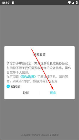 1、打開迪速幫,在彈出的隱私政策頁面點擊同意。
