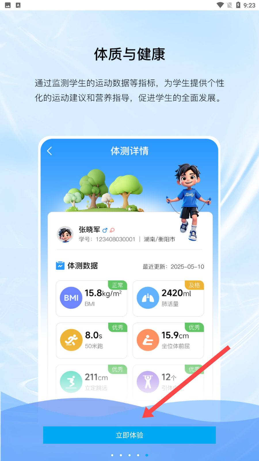 1、進(jìn)入app后顯示功能介紹,提供個性化運(yùn)動、營養(yǎng)建議,點(diǎn)擊立即體驗(yàn)進(jìn)入。