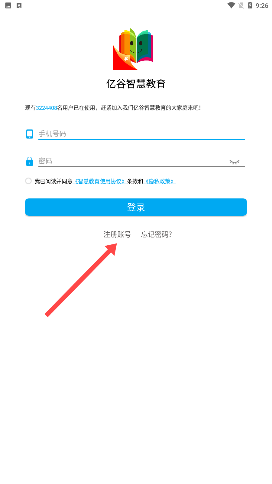 2、第一張圖是登錄界面,顯示有億谷智慧教育標(biāo)識,可輸入手機(jī)號碼、密碼,勾選協(xié)議后登錄,也能點(diǎn)擊注冊賬號去注冊。