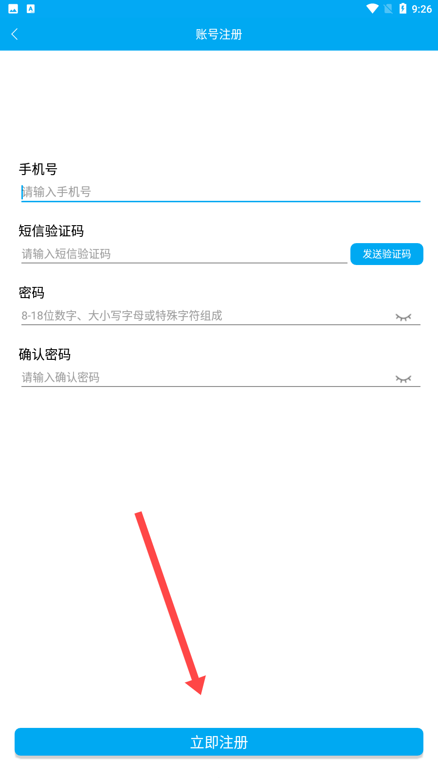3、第二張圖是賬號注冊界面,需依次填入手機(jī)號、獲取并填入短信驗(yàn)證碼,密碼并確認(rèn),完成后點(diǎn)立即注冊。