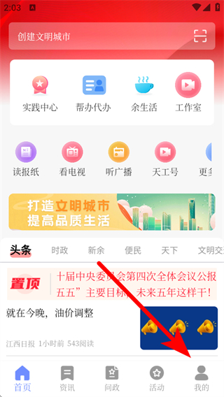 1、打開天工新余APP,點(diǎn)擊右下角我的,進(jìn)入個(gè)人頁面。