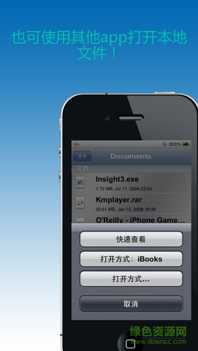 5. 你可以從郵件,瀏覽器,或其他支持“打開方式”功能的app中打開RAR, Zip, CBR文件,并在本地解壓縮(支持密碼解壓縮, 分卷解壓縮); 同時允許其他app打開本地文件(僅需按住文件的圖標不放,“Open-in”菜單就會自動打開)。