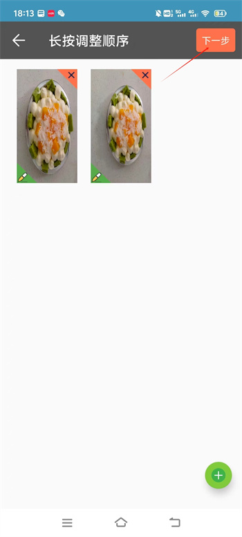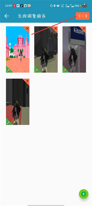 4、在這里就會看到自己選中的圖片,長按圖片可以拖動自己圖片的位置順序,點擊右下角的加號可以增加自己制作的圖片,之后再次點擊右上角的【下一步】;