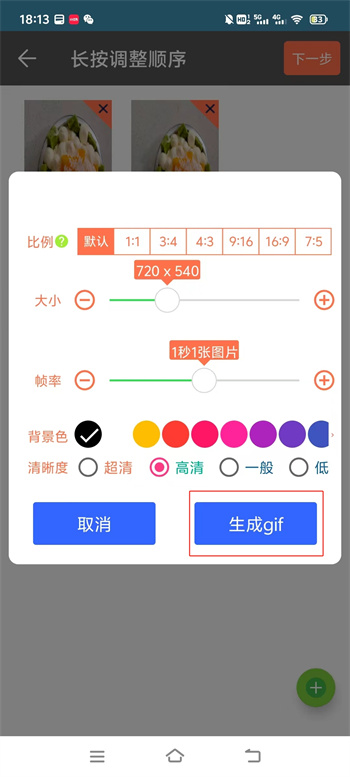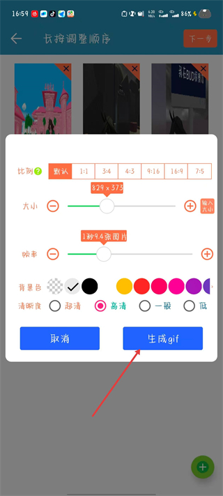 5、在這里為自己選擇點擊比例、大小、幀率、背景色、清晰度,制作出自己想要的gif最終效果,設(shè)置完成之后就可以點擊【生成gif】;