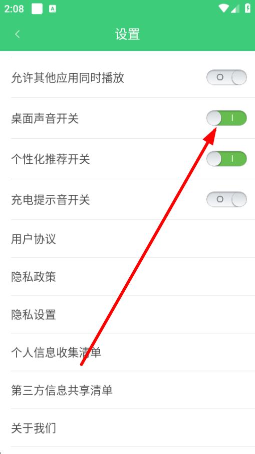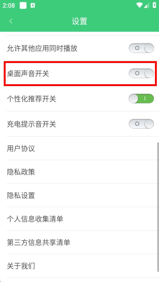 3、在設置界面里找到桌面聲音開關選項,其右側有開關按鈕。