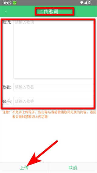 4、在上傳歌詞頁面,輸入歌詞、歌名、歌手后點擊上傳,完成歌詞上傳操作。