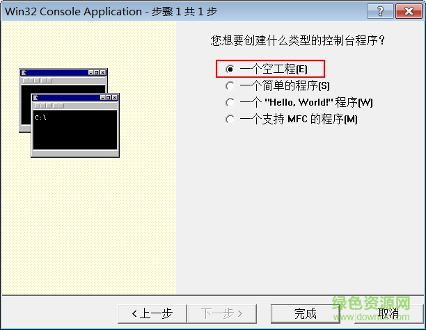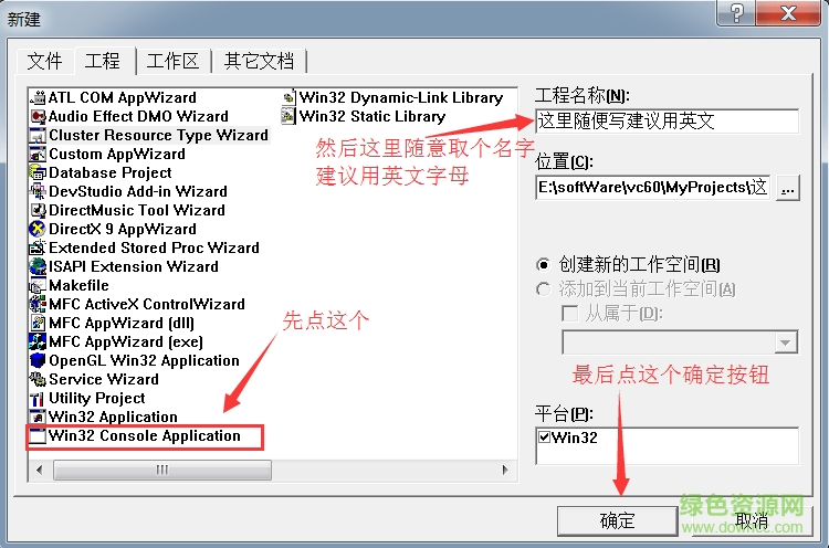 3.切換到“工程”選項(xiàng)卡,選擇“Win32 Console Application”,填寫工程名稱和路徑,點(diǎn)擊“確定”,會(huì)彈出一個(gè)對(duì)話框詢問(wèn)類型,這里選擇“一個(gè)空工程”,如下圖所示: