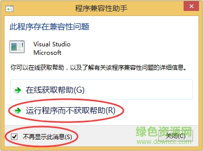 在VC6.0運(yùn)行過(guò)程中,如果彈出下面的兼容性提示框,勾選“不再顯示此消息”,關(guān)閉即可。