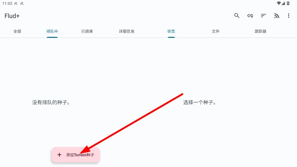 1、打開Flud+應(yīng)用,在主界面點(diǎn)擊添加Torrent種子按鈕。