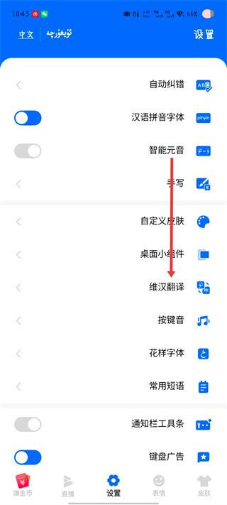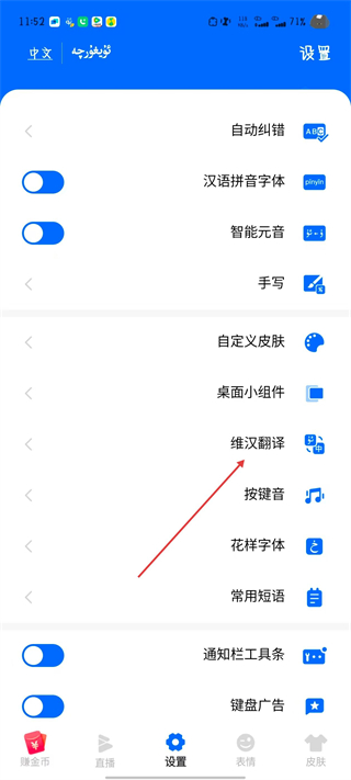 2、在設(shè)置頁(yè)面,點(diǎn)擊維漢翻譯選項(xiàng)。