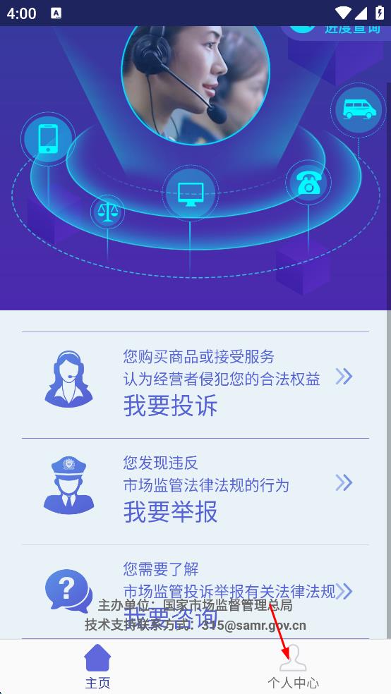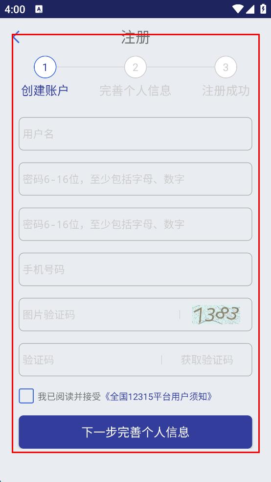 4、進(jìn)入完善個(gè)人信息環(huán)節(jié),按照提示填寫相關(guān)個(gè)人信息,完成后即可完成注冊(cè),后續(xù)可使用賬號(hào)登錄平臺(tái),進(jìn)行投訴、舉報(bào)等操作。