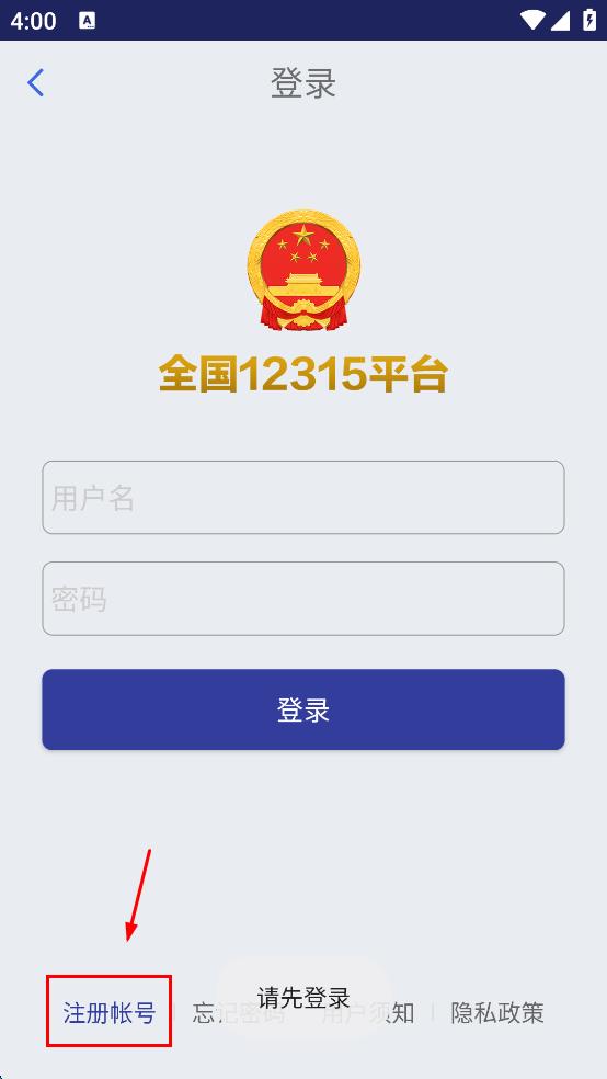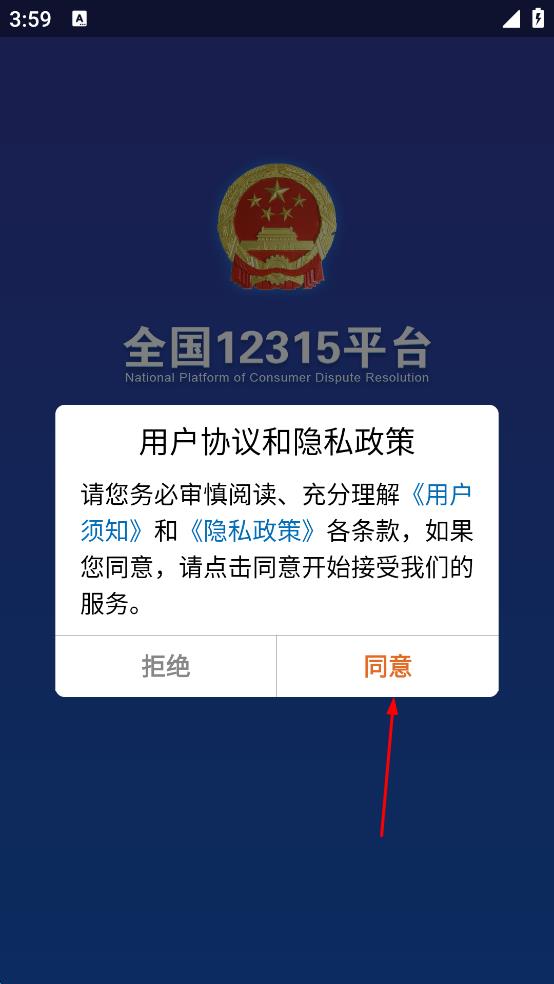 1、打開全國12315平臺(tái)應(yīng)用,彈出“用戶協(xié)議和隱私政策”提示框,仔細(xì)閱讀后點(diǎn)擊“同意”,進(jìn)入到平臺(tái)主界面。