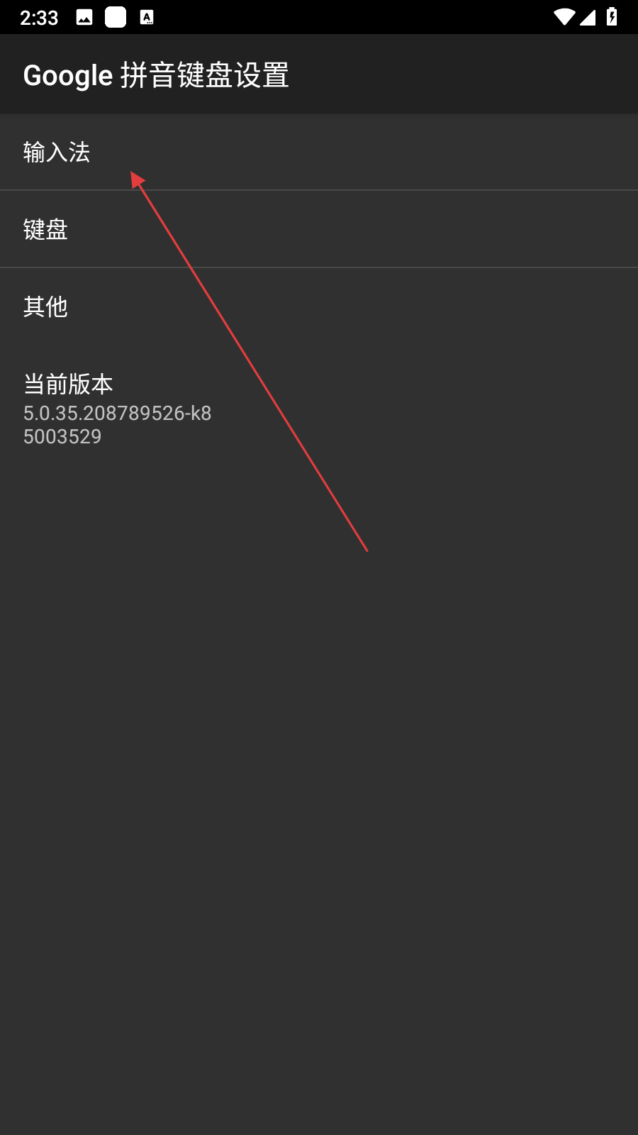 1、打開手機(jī)中Google拼音鍵盤設(shè)置應(yīng)用,進(jìn)入設(shè)置主界面,該界面呈現(xiàn)輸入法、鍵盤等設(shè)置選項。