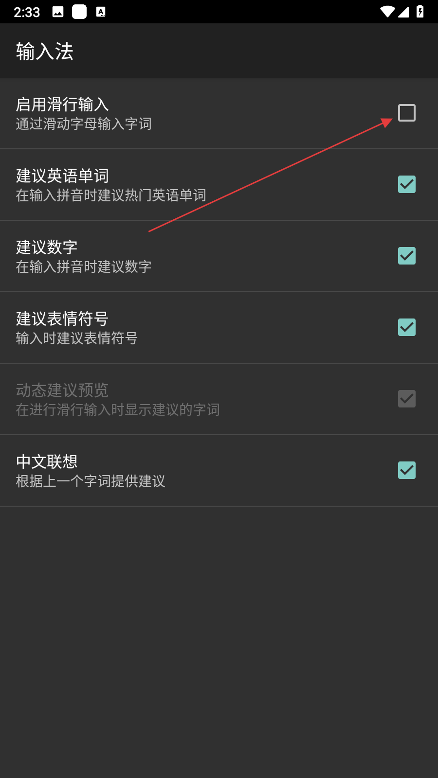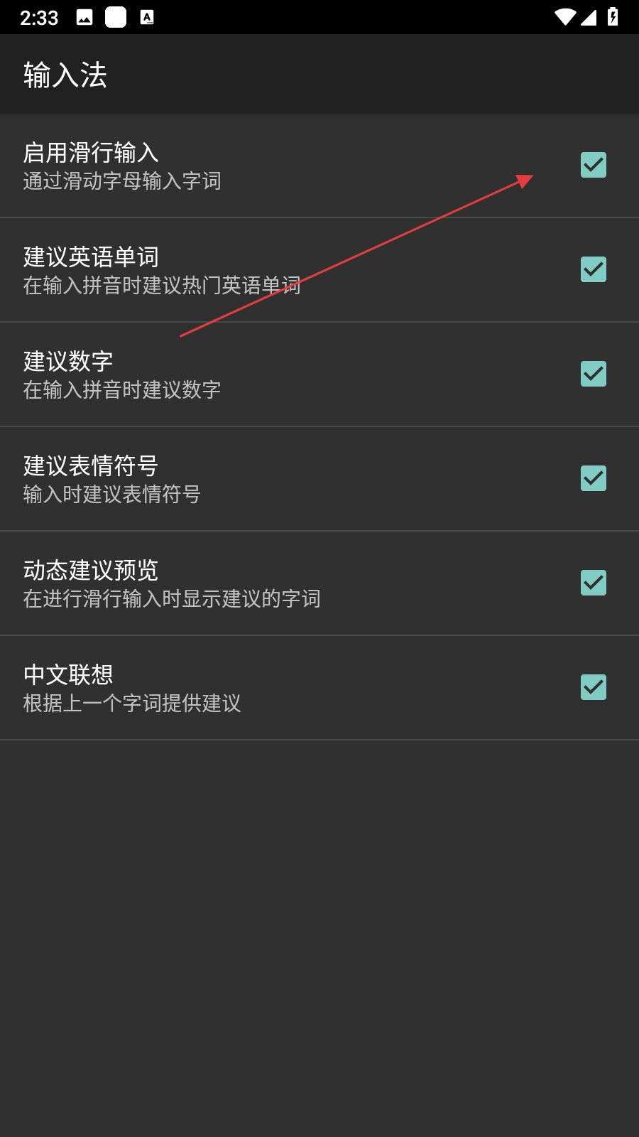 2、在設(shè)置主界面,點擊輸入法選項,跳轉(zhuǎn)至輸入法設(shè)置頁面,可看到啟用滑行輸入等功能項。