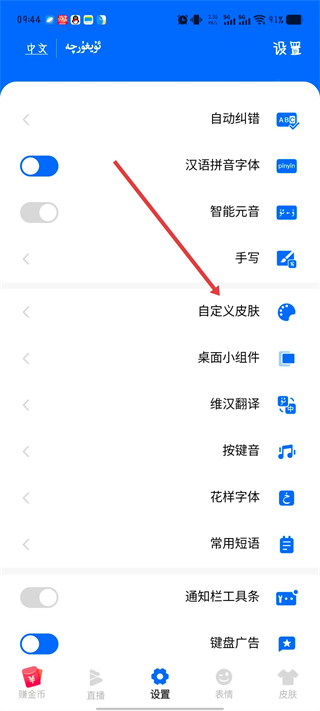 2、找到自定義皮膚選項并點擊,進入皮膚自定義頁面。
